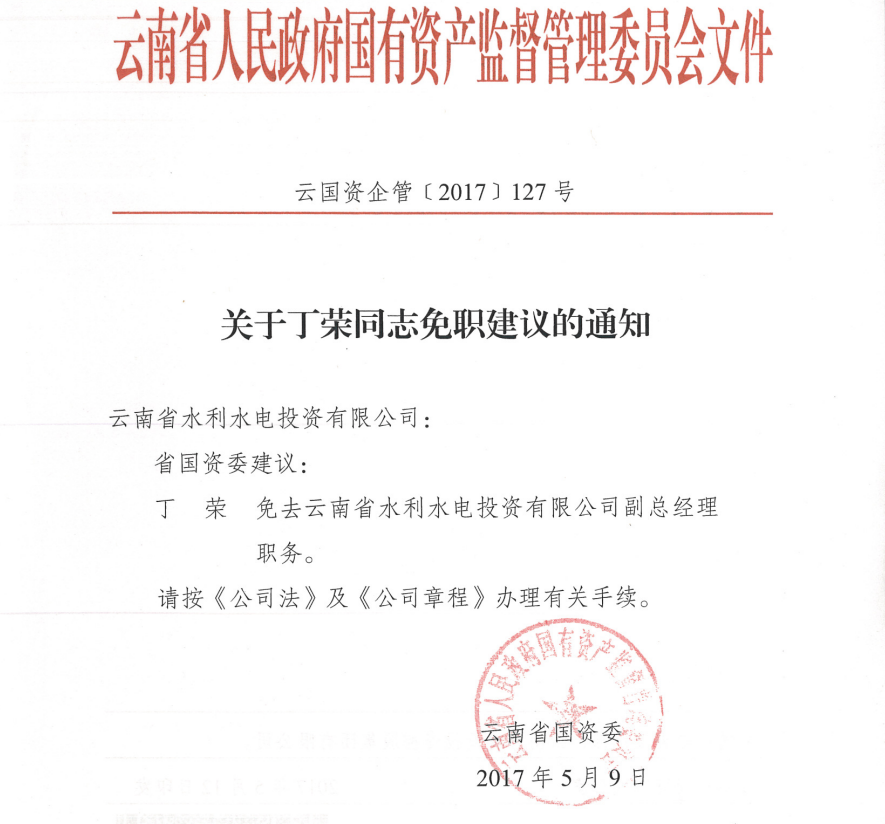 云南省游艇会yth0008委关于丁荣同志免职建议的通知